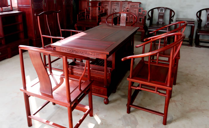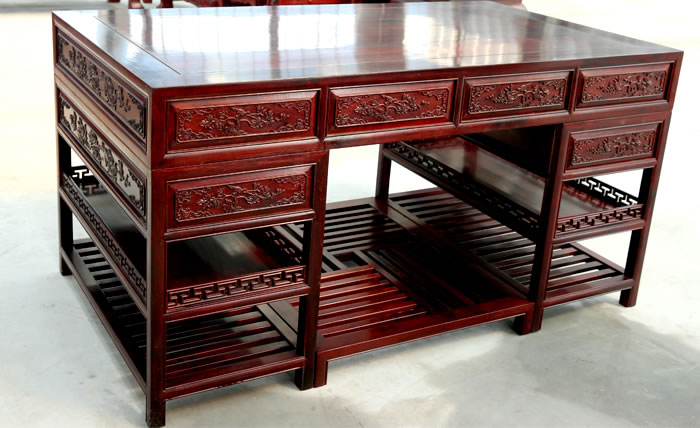 江蘇中尊木業(yè)有限公司書房系列產(chǎn)品:書房五件套草龍書柜、草龍大班枱、卷書寶座椅,洋花寫字枱等。